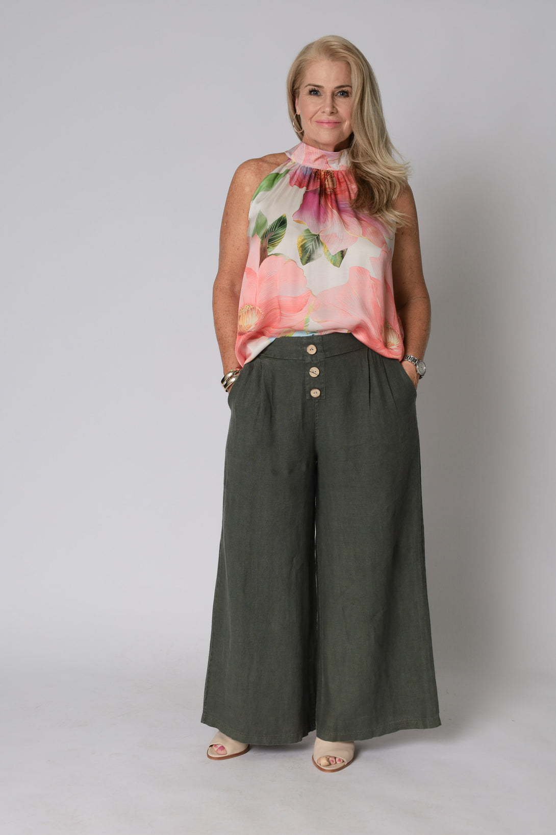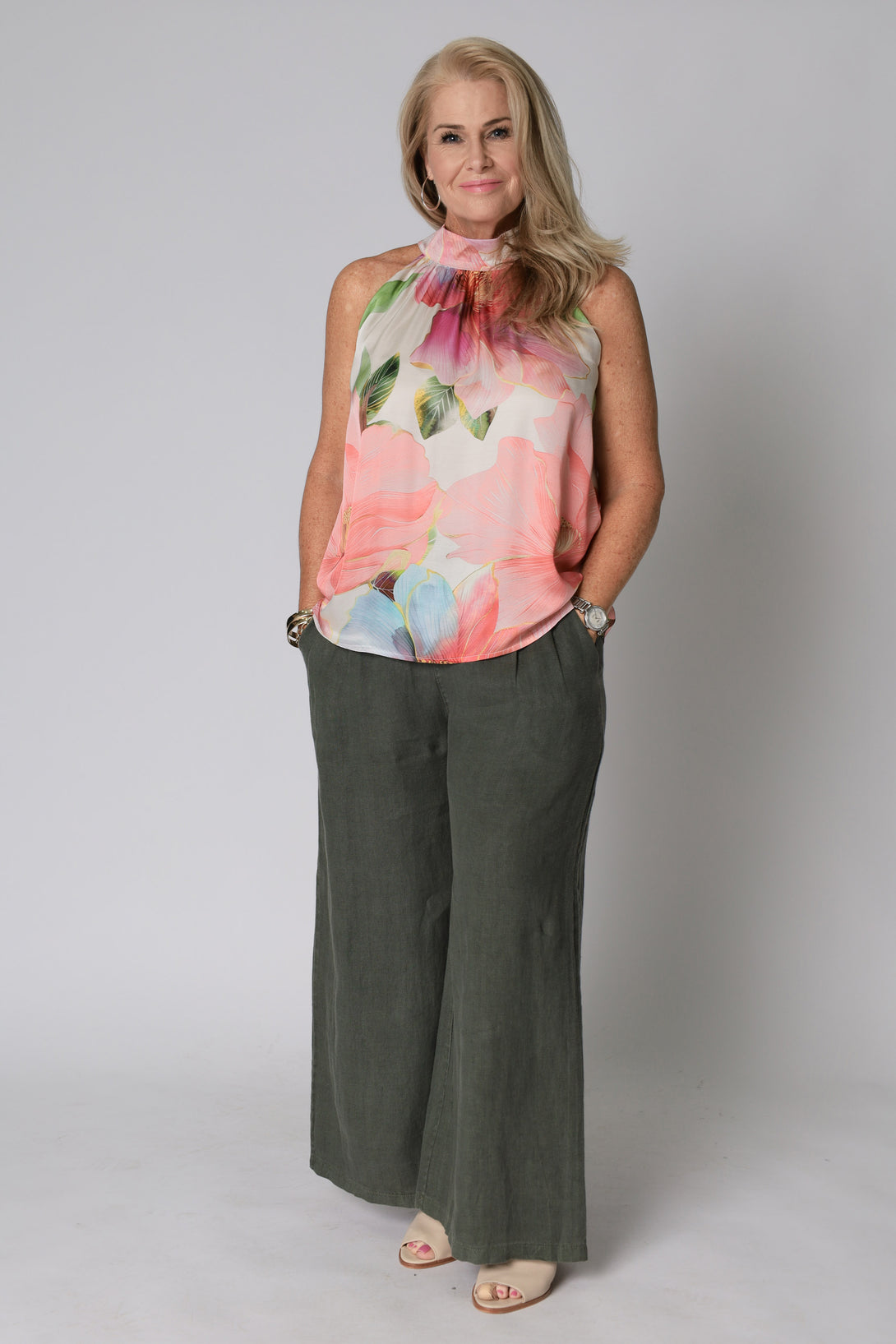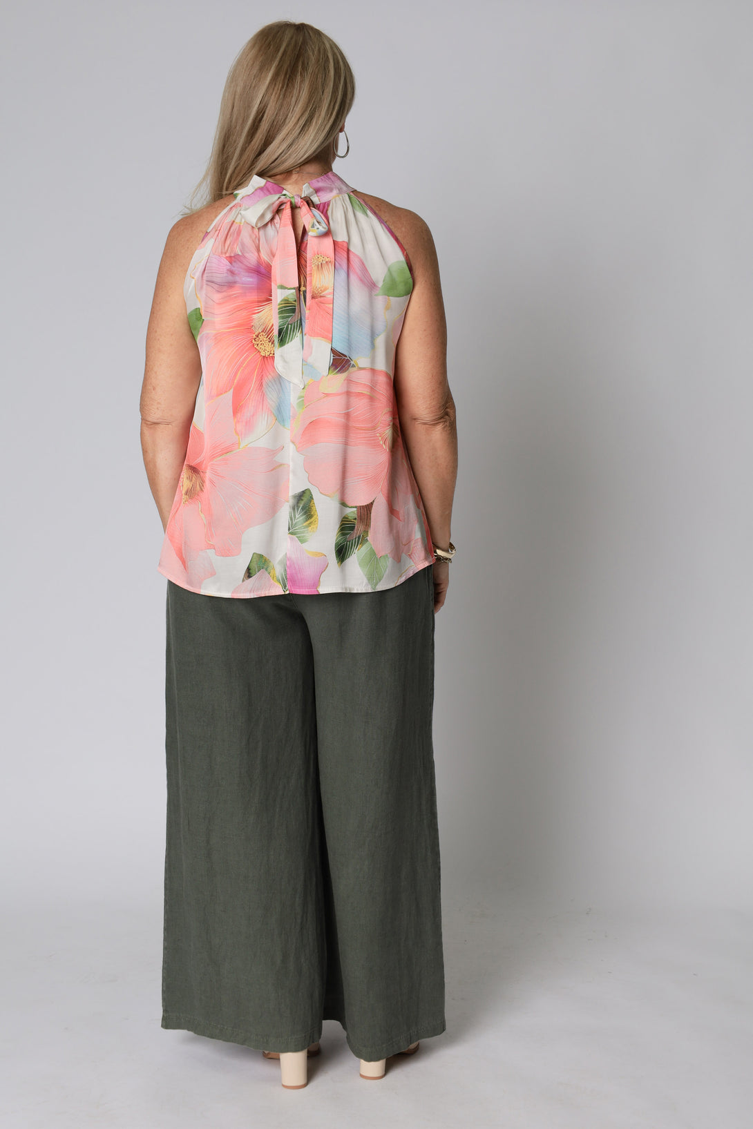 The top features a Positano Blue floral motif set against a blush backdrop, with a graceful sleeveless silhouette and a stylish tie at the back of the neck for adjustable comfort and a touch of charm. The soft drape and fluid movement of the fabric complement your figure without clinging.