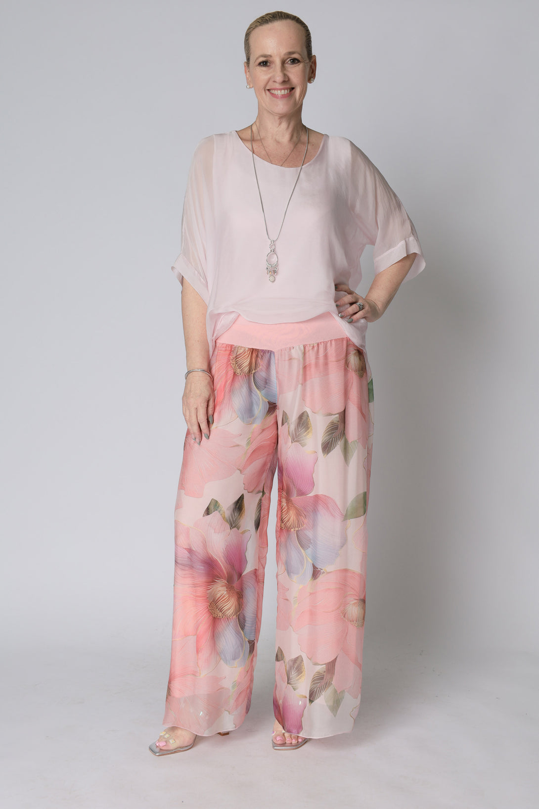 These trousers feature a striking large floral motif throughout, with a gentle blush hue that flatters all skin tones. An elasticated waistband guarantees a comfortable fit, allowing you to embrace style without sacrificing ease. The contemporary wide-leg silhouette flows beautifully, designed to sit perfectly at your natural waist.