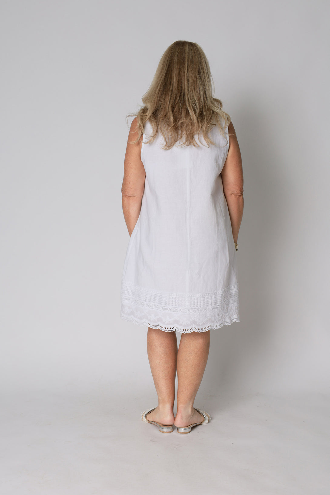 This sleeveless dress features a flattering knee-length cut and is finished with an elegant trim around the hem. Clean lines and a minimalist design emphasise its timeless appeal, while the crisp, white colour highlights your sun-kissed skin. The subtle trim detail lends just the right amount of interest, offering a modern update to a classic summer dress.